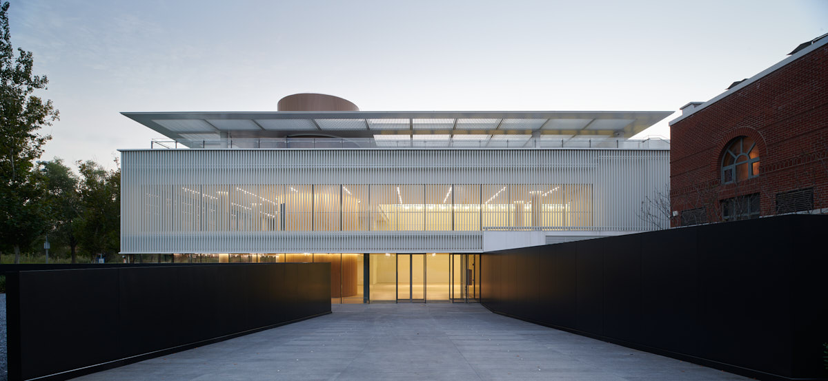 面对红砖老楼,新建筑表皮金属材质的半透明属性,通过白天夜晚自然光和人造光源投射方向的转化,在不同的时间段里呈现出来,让建筑显得轻盈舒展。